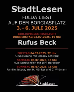 Tauche vom 3. bis 6. Juli 2025 in Fulda in ein einzigartiges Leseerlebnis ein: StadtLesen verwandelt den Borgiasplatz in eine gemütliche Freiluft-Bibliothek mit über 3.000 Büchern und spannenden Live-Lesungen.